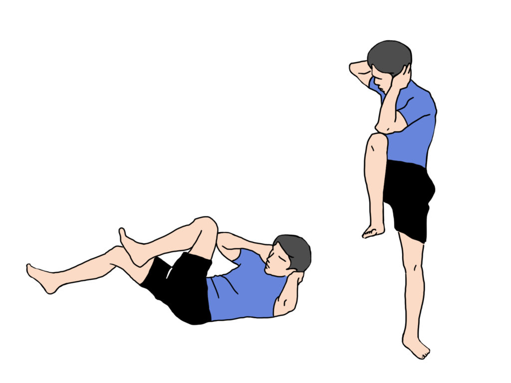 2. 右ひじと左ひざを、左ひじと右ひざを、交互に体をねじってクロスさせるようにくつっけます。